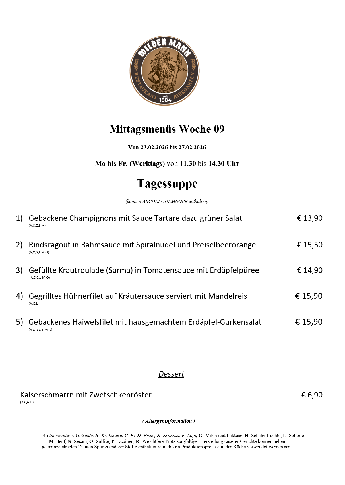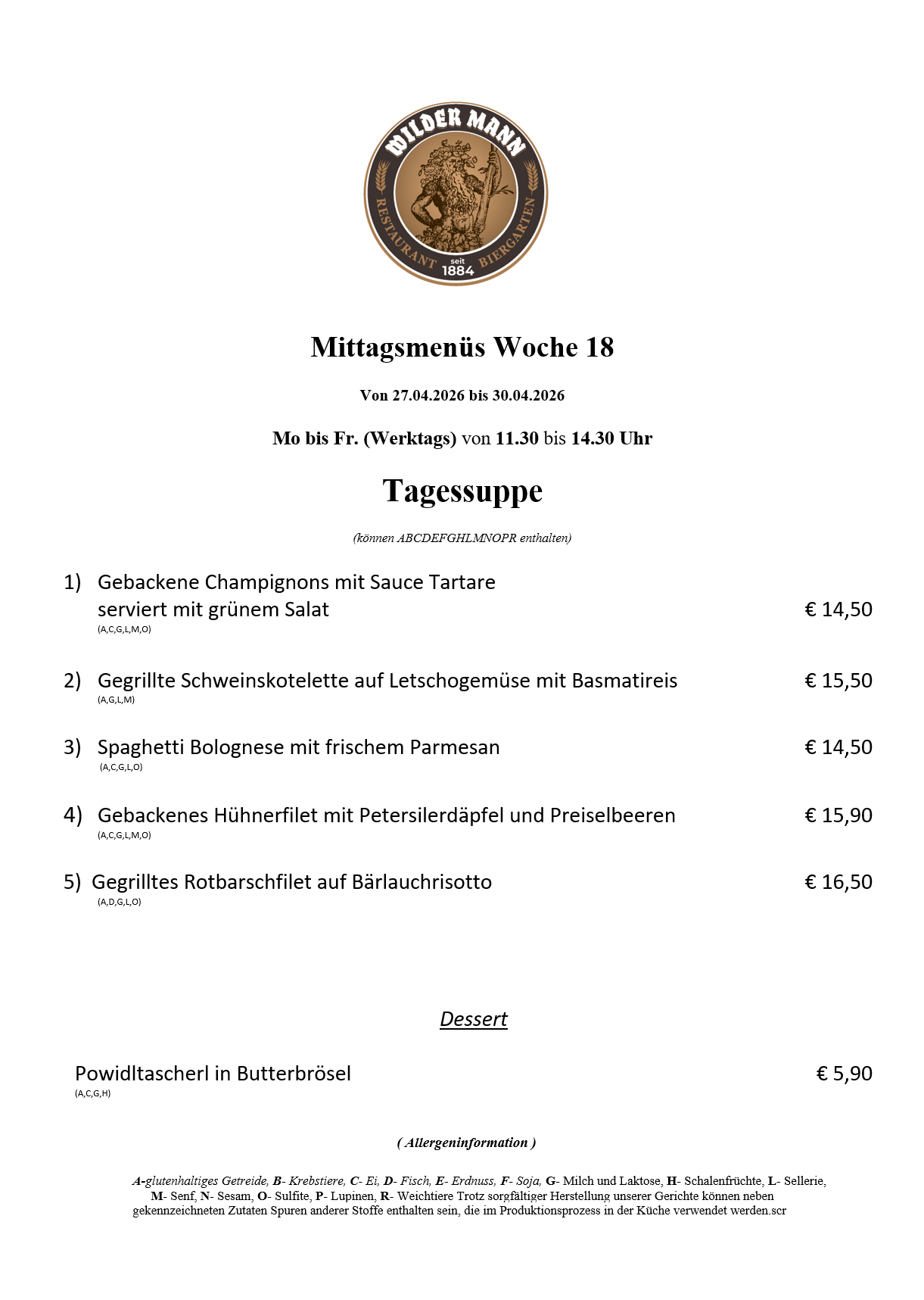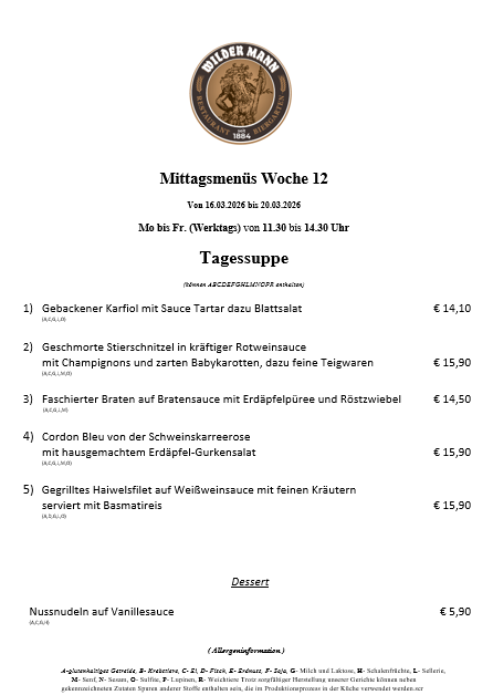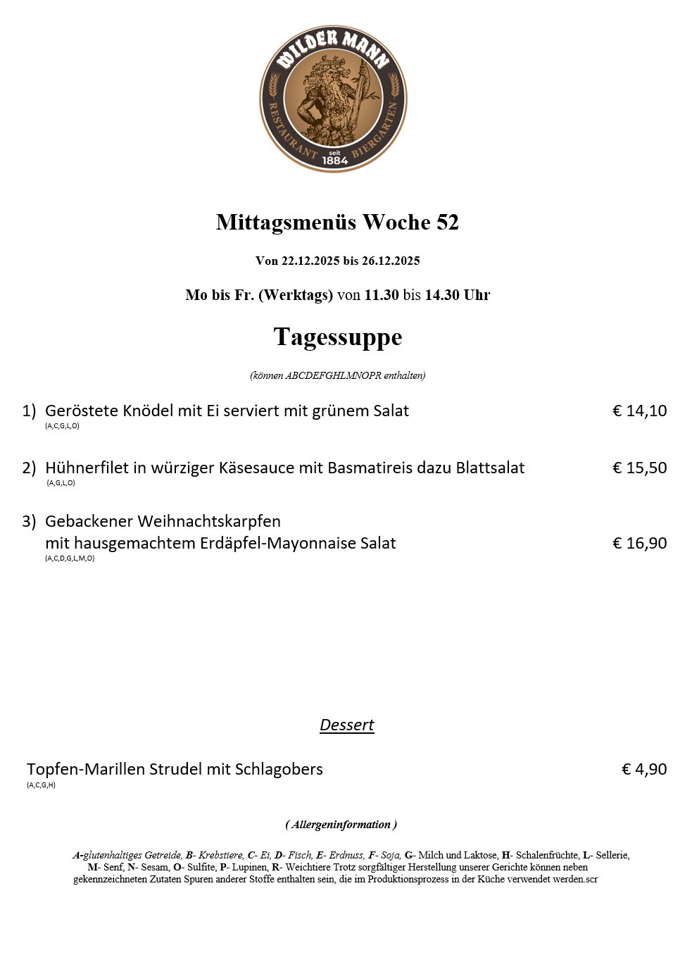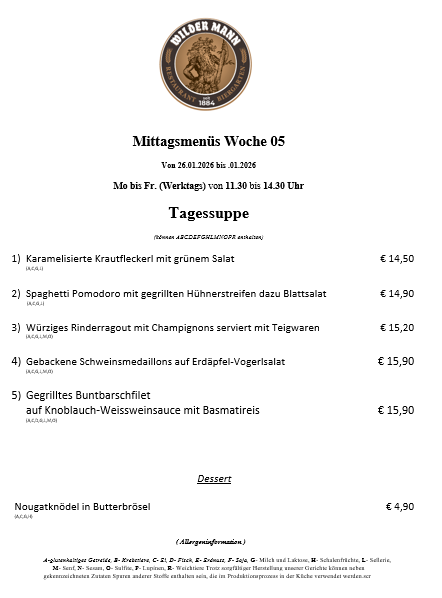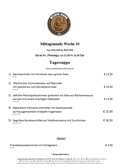 A-glutenhaltiges Getreide, B- Krebstiere, C- Ei, D- Fisch, E- Erdnuss, F- Soja, G- Milch und Laktose, H- Schalenfrüchte, L- Sellerie, M- Senf, N- Sesam, O- Sulfite, P- Lupinen, R- Weichtiere Trotz sorgfältiger Herstellung unserer Gerichte können neben gekennzeichneten Zutaten Spuren anderer Stoffe enthalten sein, die im Produktionsprozess in der Küche verwendet werden.