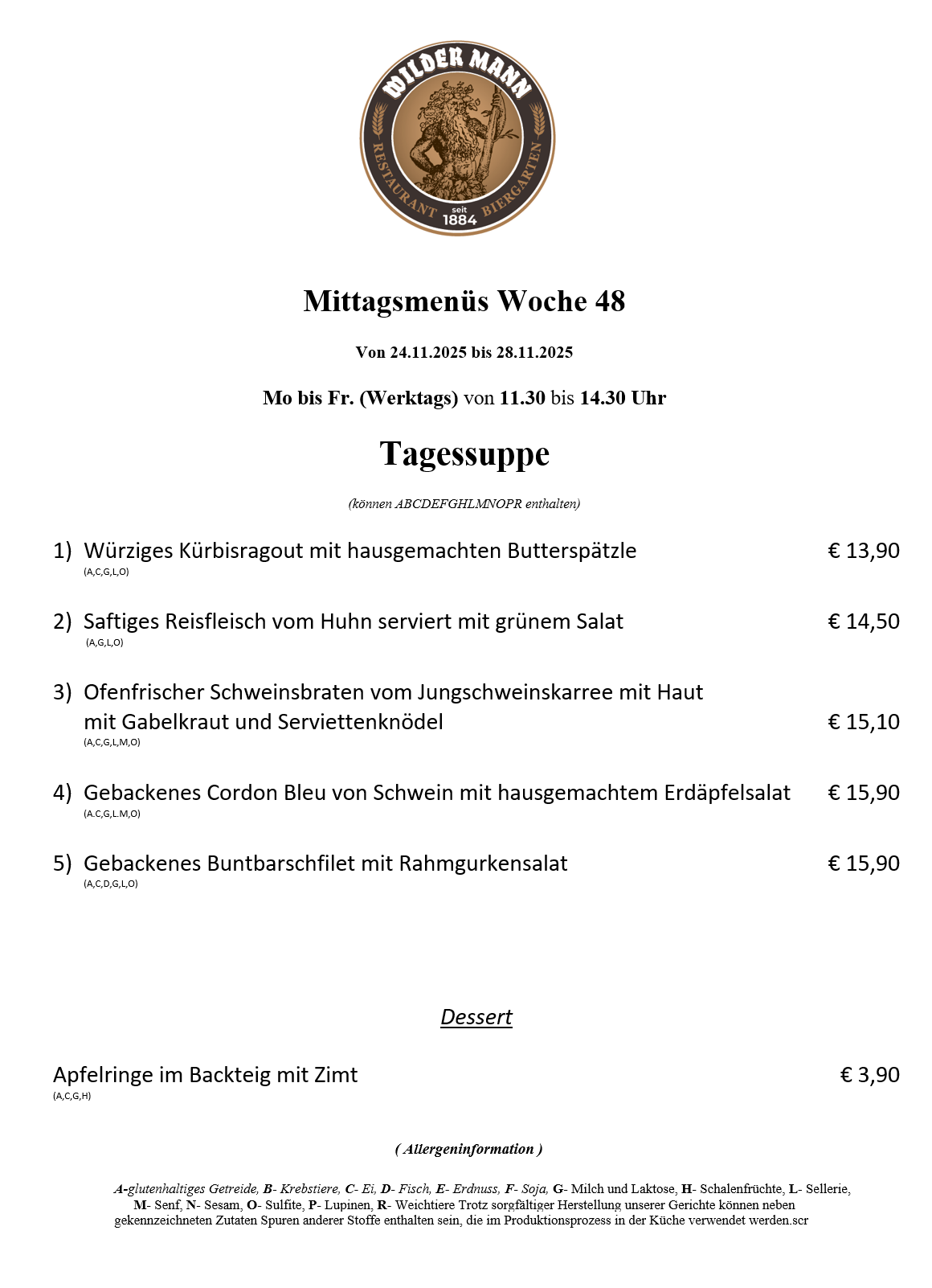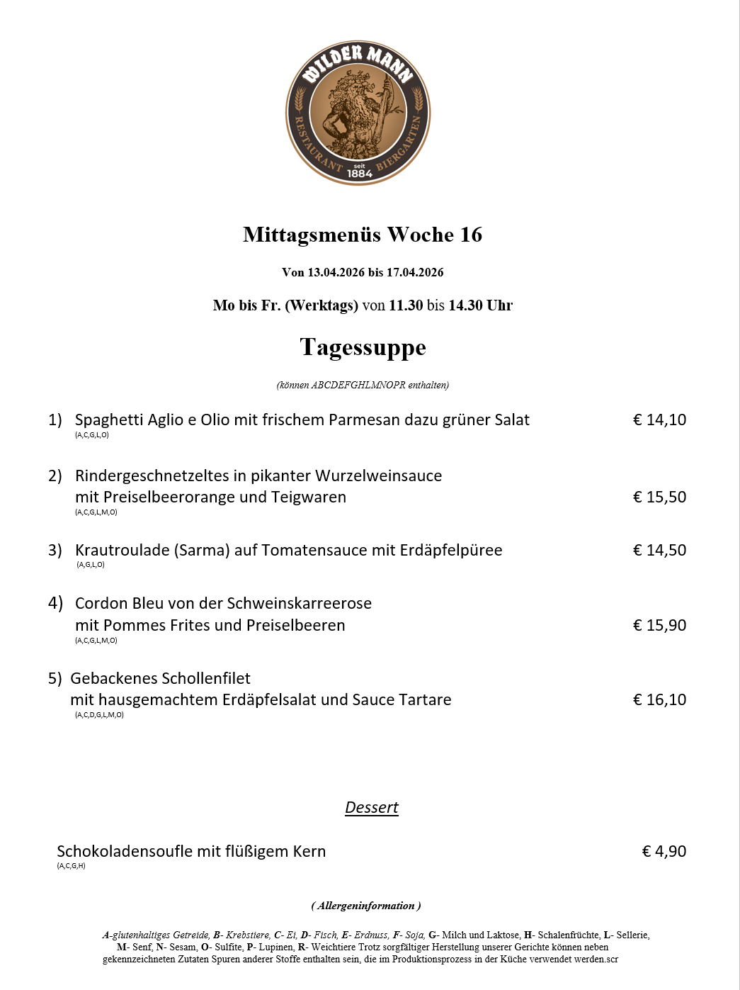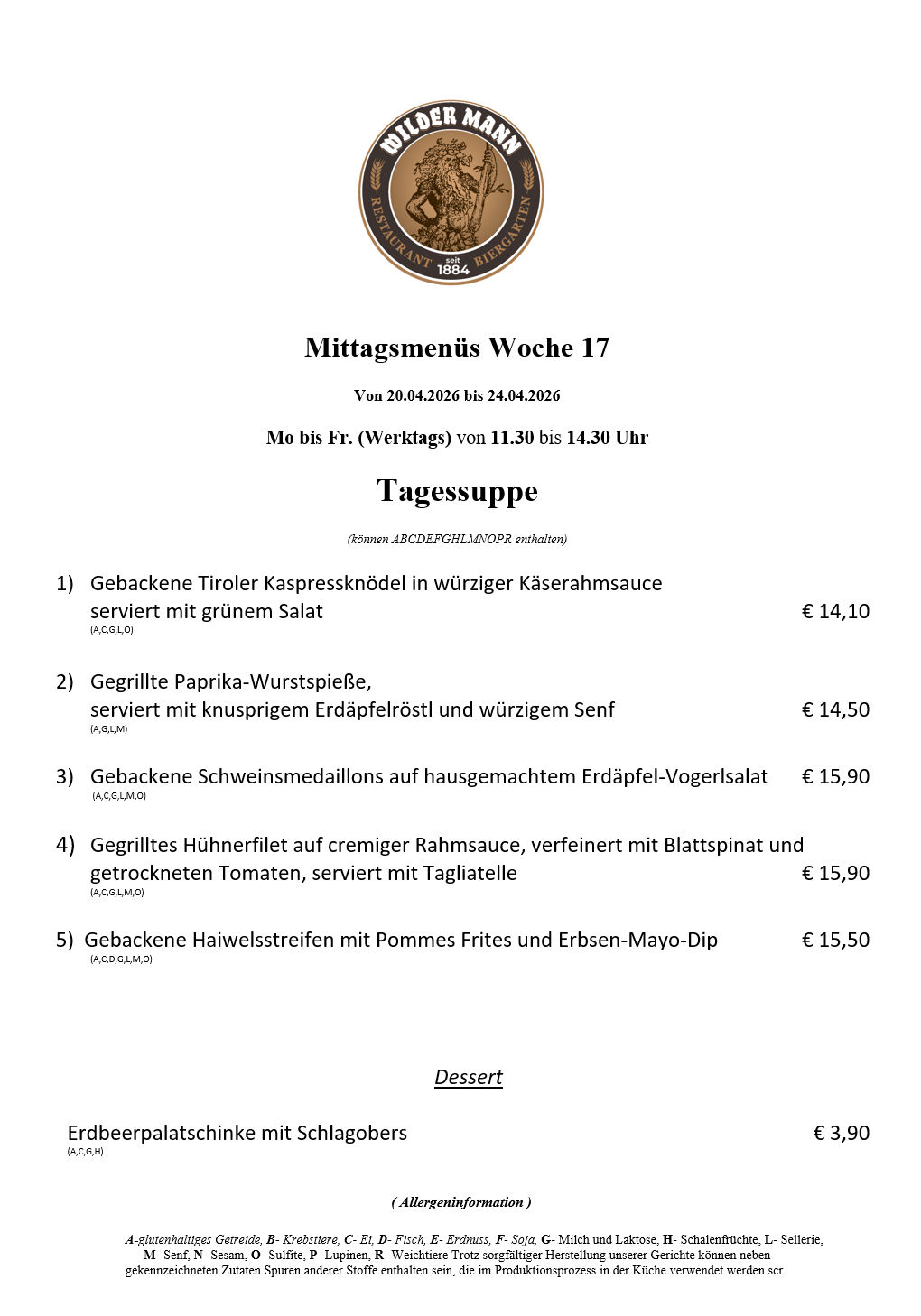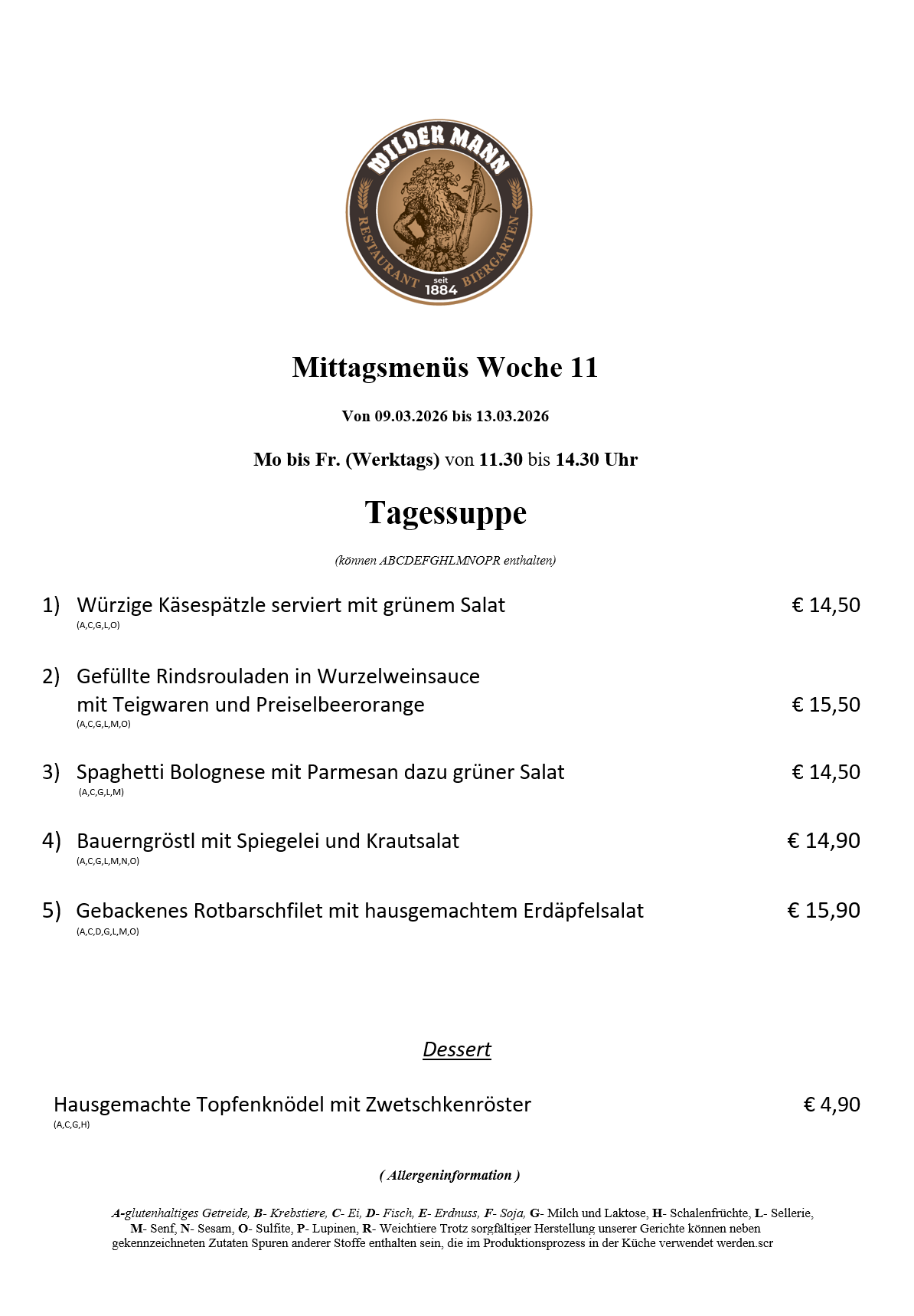 A-glutenhaltiges Getreide, B- Krebstiere, C- Ei, D- Fisch, E- Erdnuss, F- Soja, G- Milch und Laktose, H- Schalenfrüchte, L- Sellerie, M- Senf, N- Sesam, O- Sulfite, P- Lupinen, R- Weichtiere Trotz sorgfältiger Herstellung unserer Gerichte können neben gekennzeichneten Zutaten Spuren anderer Stoffe enthalten sein, die im Produktionsprozess in der Küche verwendet werden.
