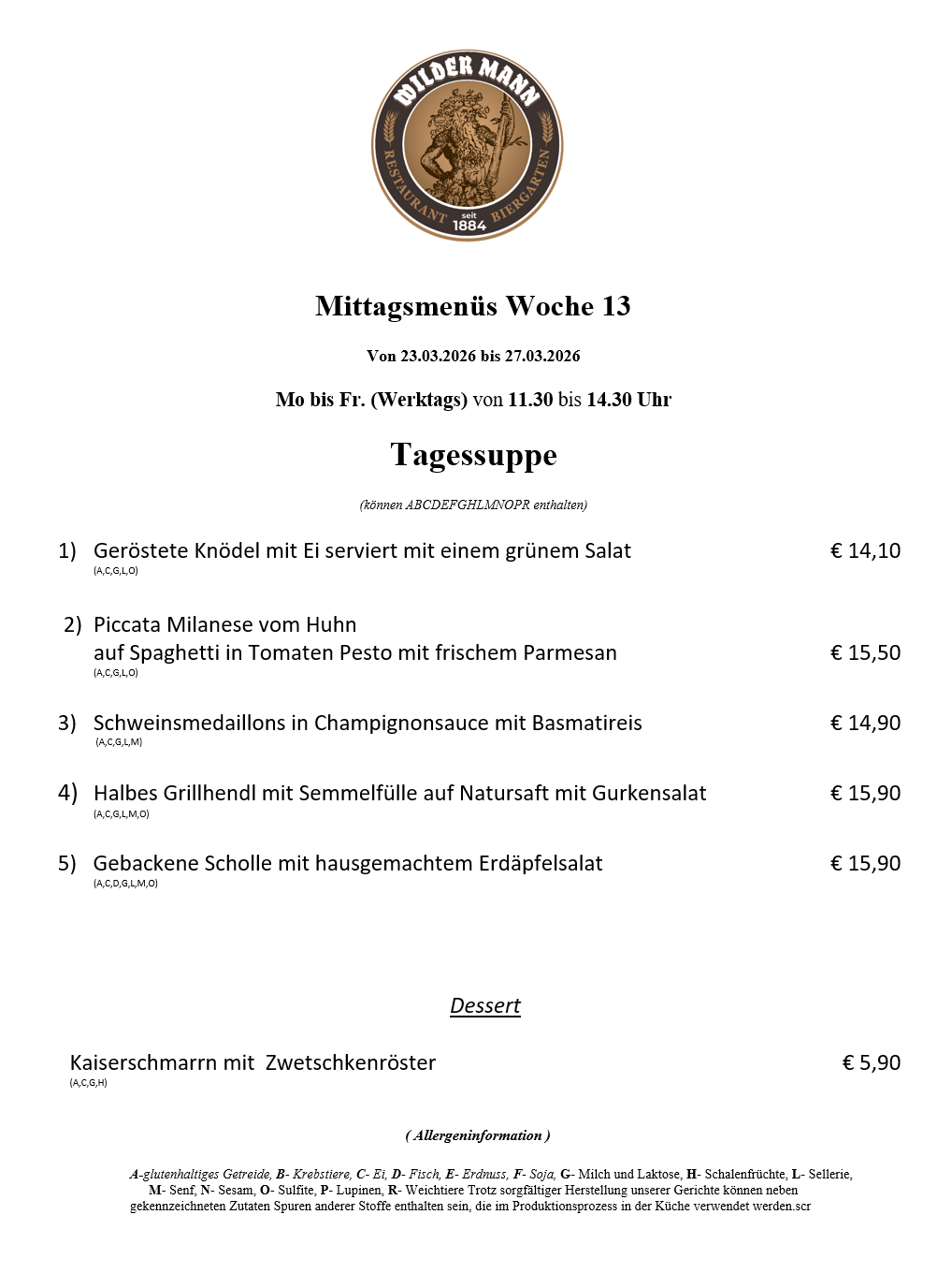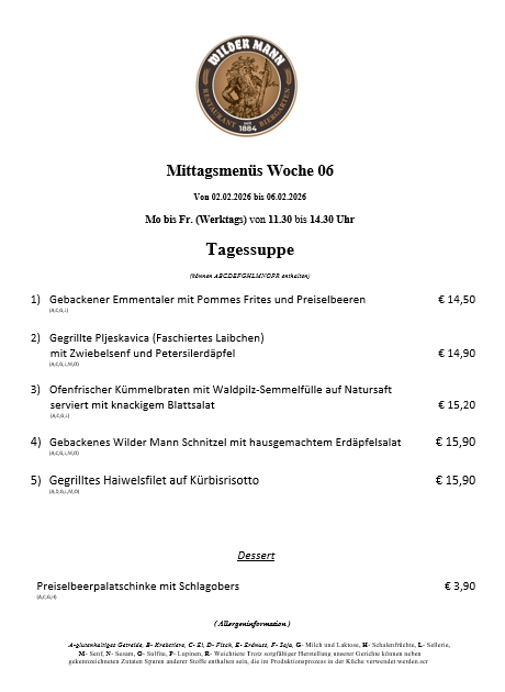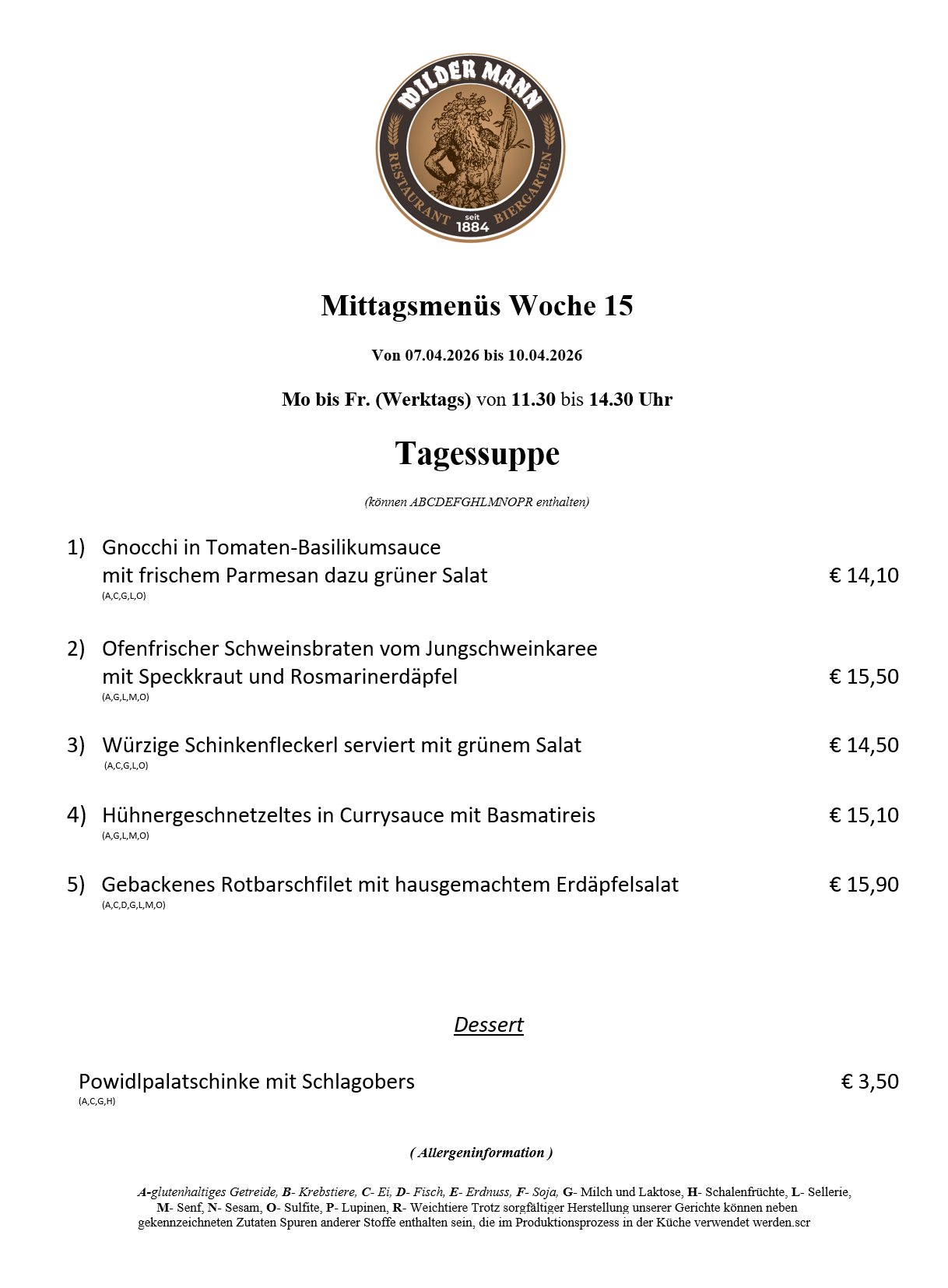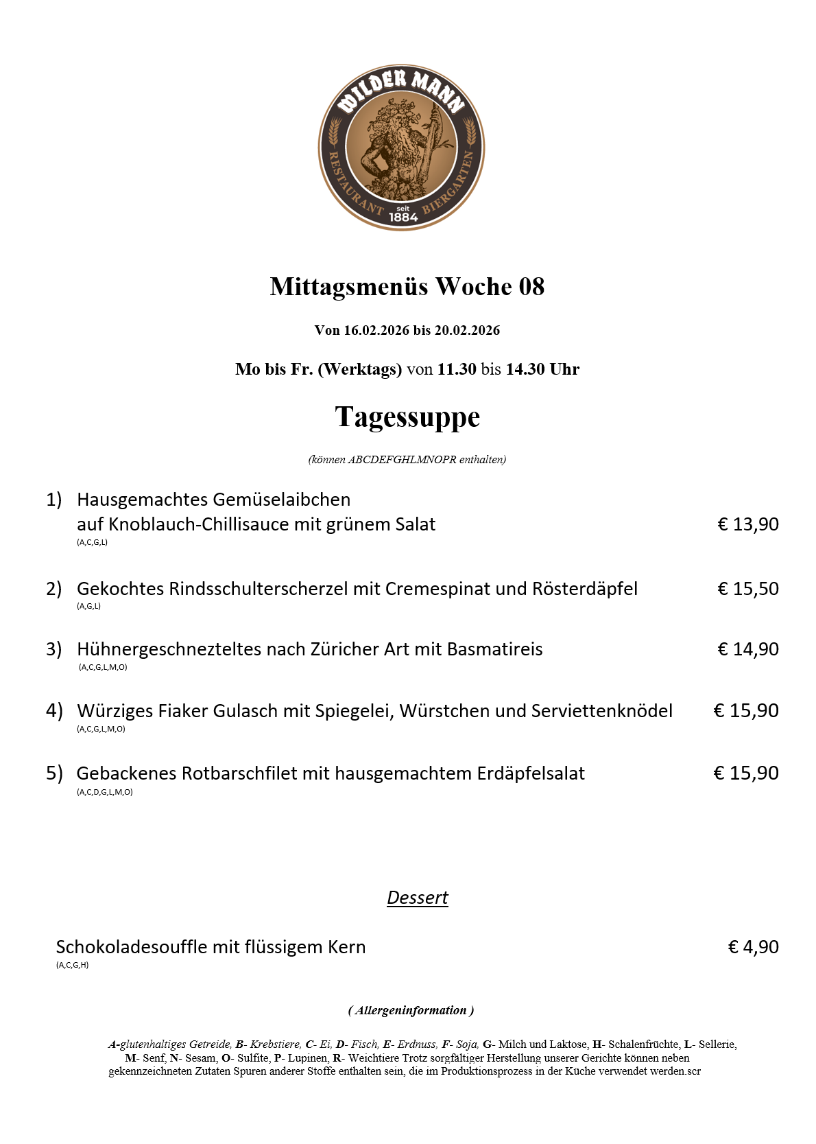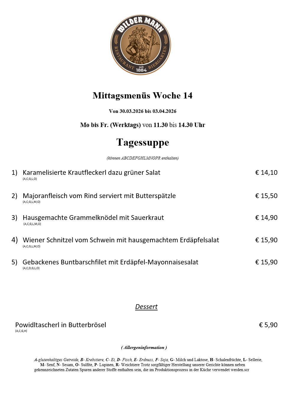 A-glutenhaltiges Getreide, B- Krebstiere, C- Ei, D- Fisch, E- Erdnuss, F- Soja, G- Milch und Laktose, H- Schalenfrüchte, L- Sellerie, M- Senf, N- Sesam, O- Sulfite, P- Lupinen, R- Weichtiere Trotz sorgfältiger Herstellung unserer Gerichte können neben gekennzeichneten Zutaten Spuren anderer Stoffe enthalten sein, die im Produktionsprozess in der Küche verwendet werden.