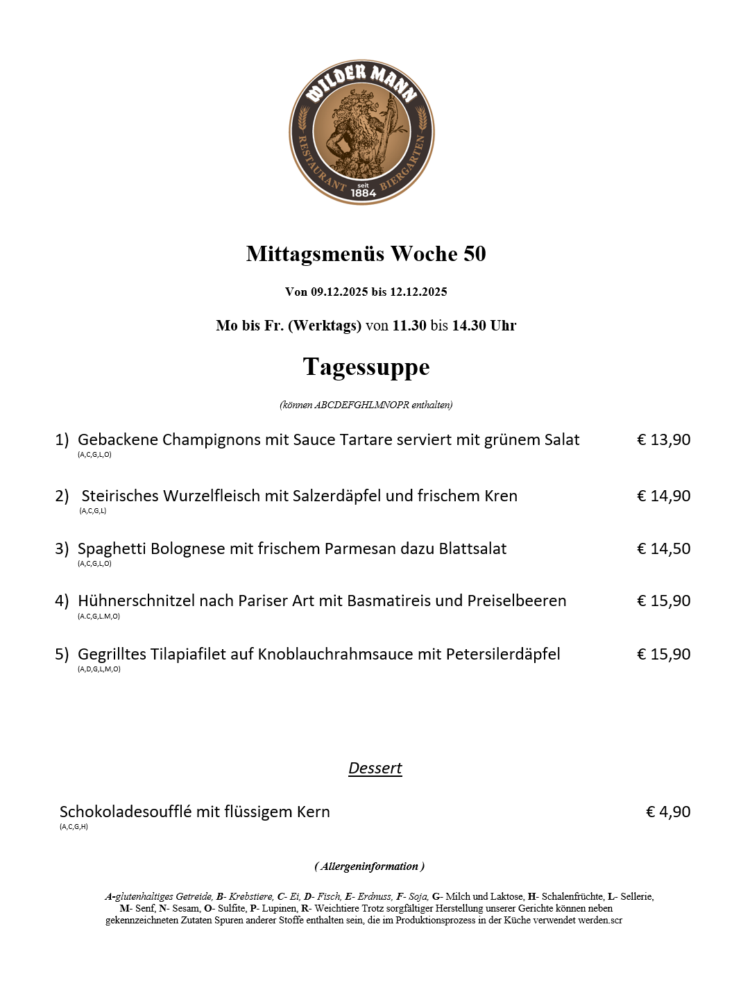 A-glutenhaltiges Getreide, B- Krebstiere, C- Ei, D- Fisch, E- Erdnuss, F- Soja, G- Milch und Laktose, H- Schalenfrüchte, L- Sellerie, M- Senf, N- Sesam, O- Sulfite, P- Lupinen, R- Weichtiere Trotz sorgfältiger Herstellung unserer Gerichte können neben gekennzeichneten Zutaten Spuren anderer Stoffe enthalten sein, die im Produktionsprozess in der Küche verwendet werden.