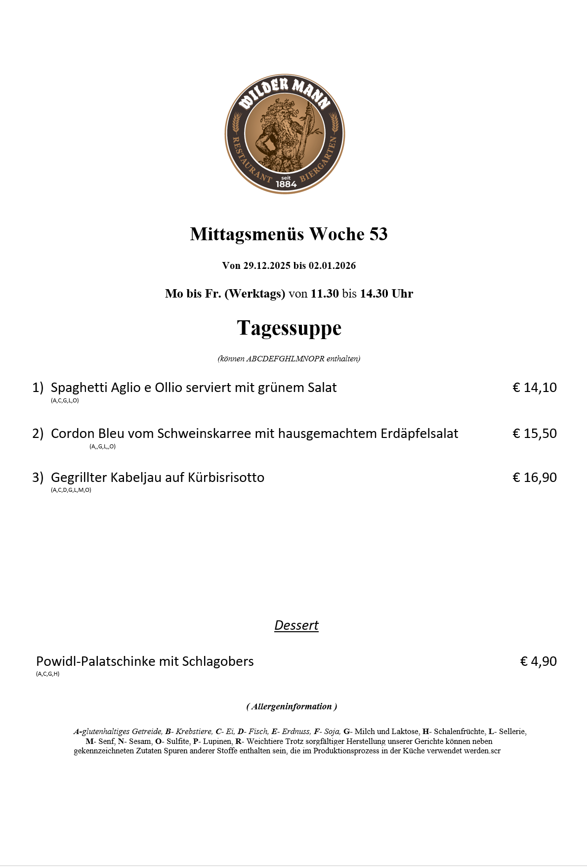 A-glutenhaltiges Getreide, B- Krebstiere, C- Ei, D- Fisch, E- Erdnuss, F- Soja, G- Milch und Laktose, H- Schalenfrüchte, L- Sellerie, M- Senf, N- Sesam, O- Sulfite, P- Lupinen, R- Weichtiere Trotz sorgfältiger Herstellung unserer Gerichte können neben gekennzeichneten Zutaten Spuren anderer Stoffe enthalten sein, die im Produktionsprozess in der Küche verwendet werden.