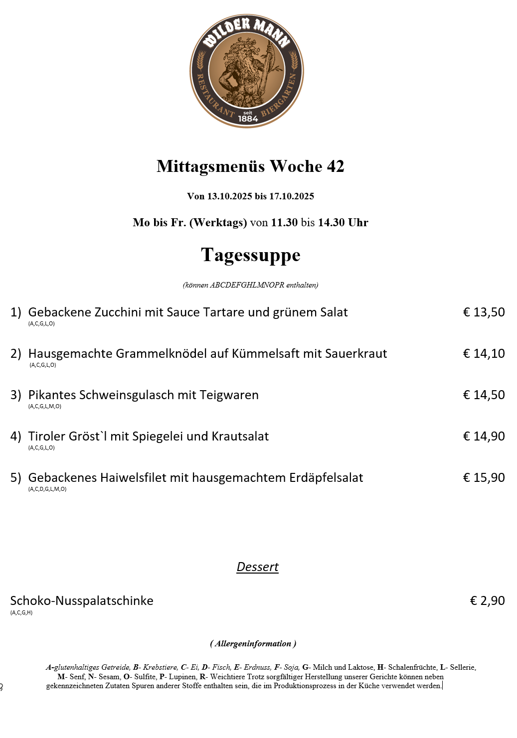 A-glutenhaltiges Getreide, B- Krebstiere, C- Ei, D- Fisch, E- Erdnuss, F- Soja, G- Milch und Laktose, H- Schalenfrüchte, L- Sellerie, M- Senf, N- Sesam, O- Sulfite, P- Lupinen, R- Weichtiere Trotz sorgfältiger Herstellung unserer Gerichte können neben gekennzeichneten Zutaten Spuren anderer Stoffe enthalten sein, die im Produktionsprozess in der Küche verwendet werden.