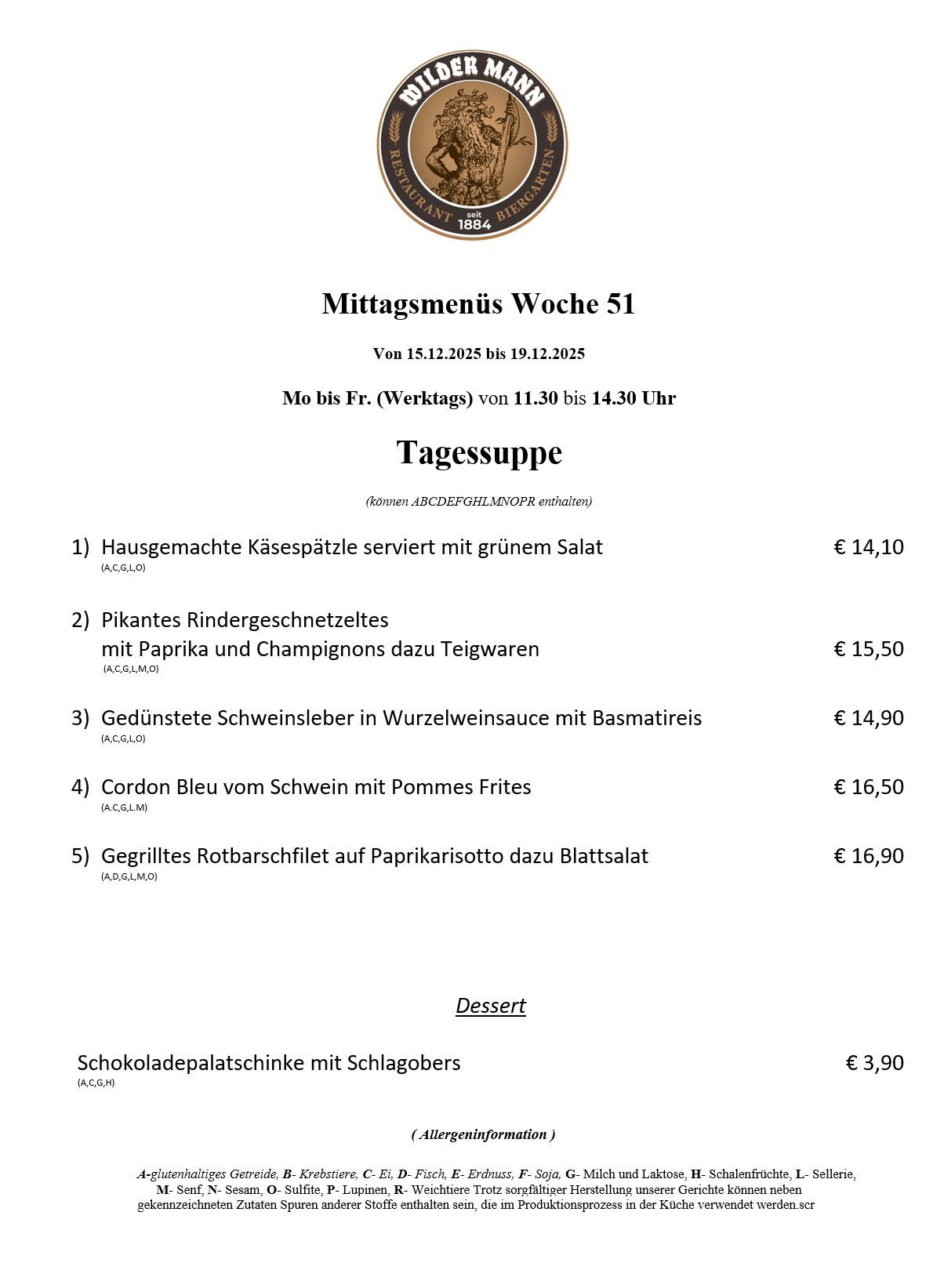 A-glutenhaltiges Getreide, B- Krebstiere, C- Ei, D- Fisch, E- Erdnuss, F- Soja, G- Milch und Laktose, H- Schalenfrüchte, L- Sellerie, M- Senf, N- Sesam, O- Sulfite, P- Lupinen, R- Weichtiere Trotz sorgfältiger Herstellung unserer Gerichte können neben gekennzeichneten Zutaten Spuren anderer Stoffe enthalten sein, die im Produktionsprozess in der Küche verwendet werden.