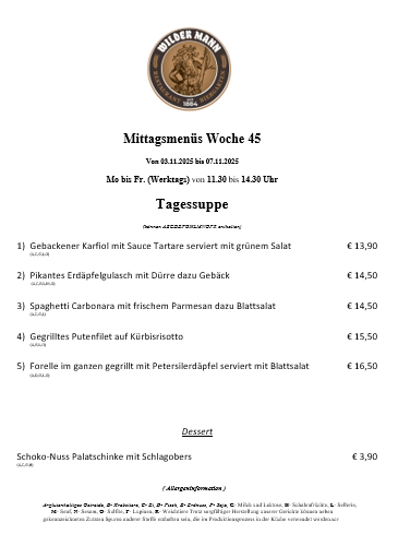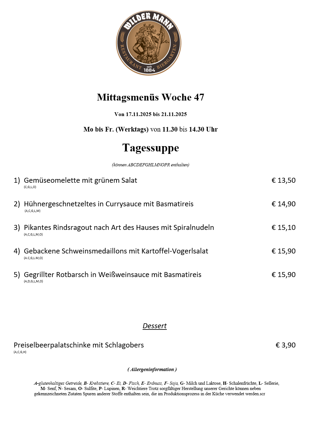 A-glutenhaltiges Getreide, B- Krebstiere, C- Ei, D- Fisch, E- Erdnuss, F- Soja, G- Milch und Laktose, H- Schalenfrüchte, L- Sellerie, M- Senf, N- Sesam, O- Sulfite, P- Lupinen, R- Weichtiere Trotz sorgfältiger Herstellung unserer Gerichte können neben gekennzeichneten Zutaten Spuren anderer Stoffe enthalten sein, die im Produktionsprozess in der Küche verwendet werden.