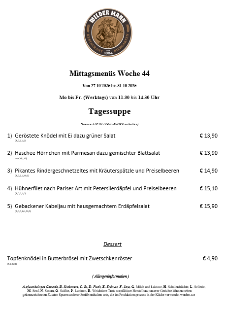 A-glutenhaltiges Getreide, B- Krebstiere, C- Ei, D- Fisch, E- Erdnuss, F- Soja, G- Milch und Laktose, H- Schalenfrüchte, L- Sellerie, M- Senf, N- Sesam, O- Sulfite, P- Lupinen, R- Weichtiere Trotz sorgfältiger Herstellung unserer Gerichte können neben gekennzeichneten Zutaten Spuren anderer Stoffe enthalten sein, die im Produktionsprozess in der Küche verwendet werden.