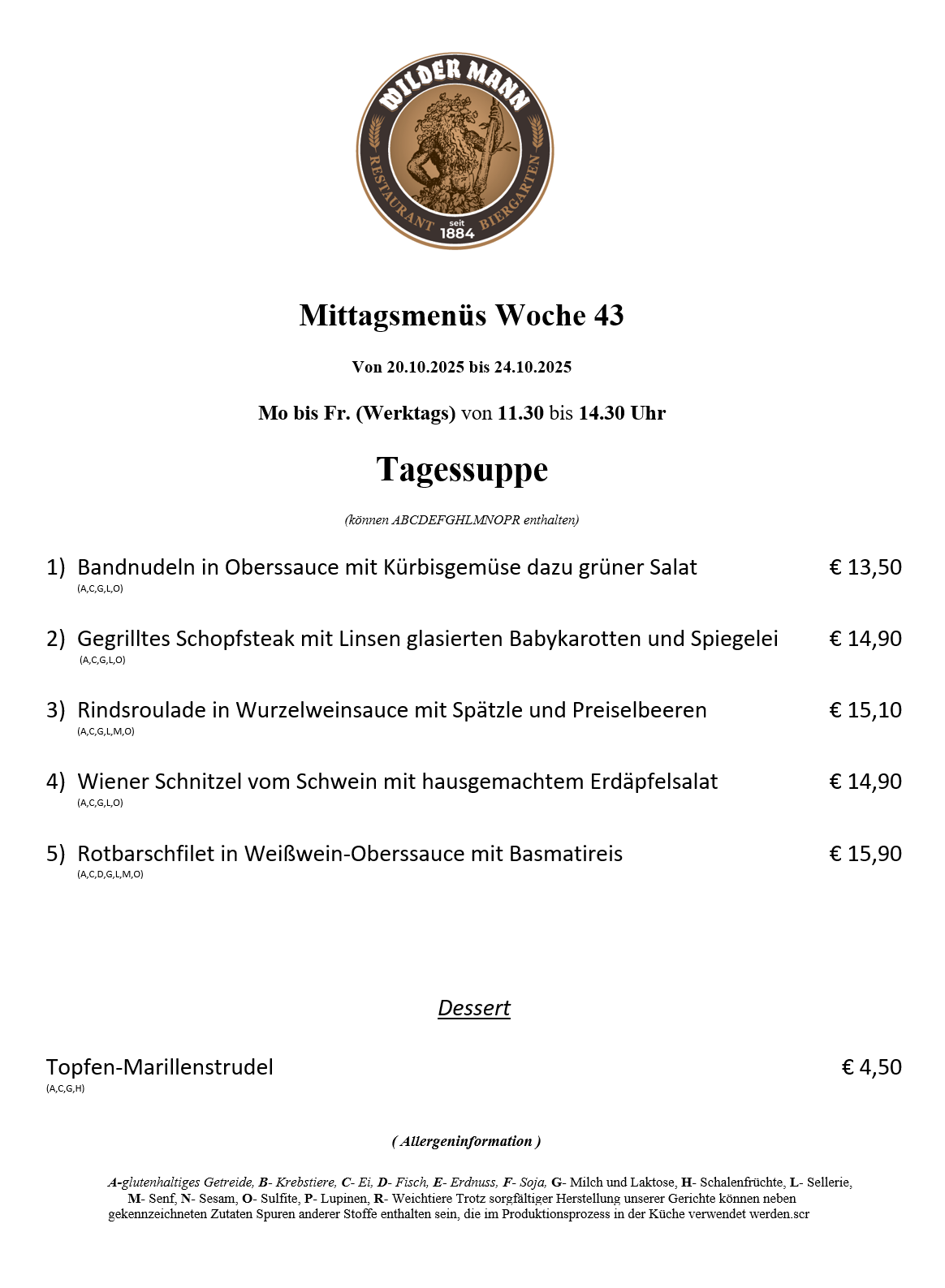 A-glutenhaltiges Getreide, B- Krebstiere, C- Ei, D- Fisch, E- Erdnuss, F- Soja, G- Milch und Laktose, H- Schalenfrüchte, L- Sellerie, M- Senf, N- Sesam, O- Sulfite, P- Lupinen, R- Weichtiere Trotz sorgfältiger Herstellung unserer Gerichte können neben gekennzeichneten Zutaten Spuren anderer Stoffe enthalten sein, die im Produktionsprozess in der Küche verwendet werden.